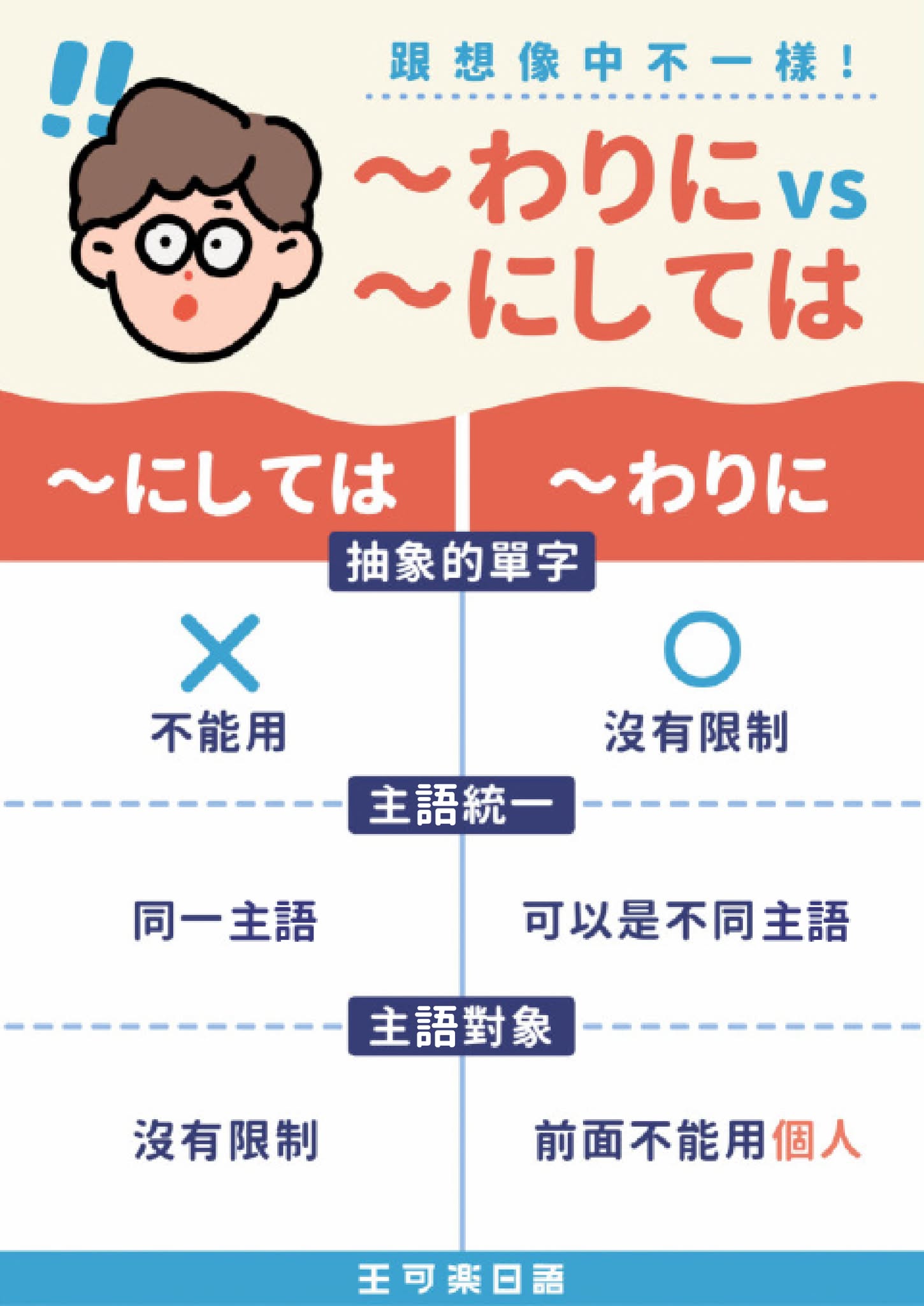 但是,「~わりに」跟「~にしては」並不完全相同,兩者還是有一些用法上的差異。今天我們就來介紹幾點兩者之間的限制與差異。