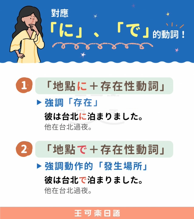 綜合以上,「地點に+存在性動詞」用來表示「存在的位置」;「地點で+動作性動詞」用來表示「動作發生的場所」,但在某些情況下,可以使用「地點に+存在性動詞」的形式,也可以用「地點で+存在性動詞」的形式表示,雖然狀況相同,但想傳達的概念是不一樣的,請同學要特別留意喔!也歡迎來我們的初級課程,學習更多文法細節喔!