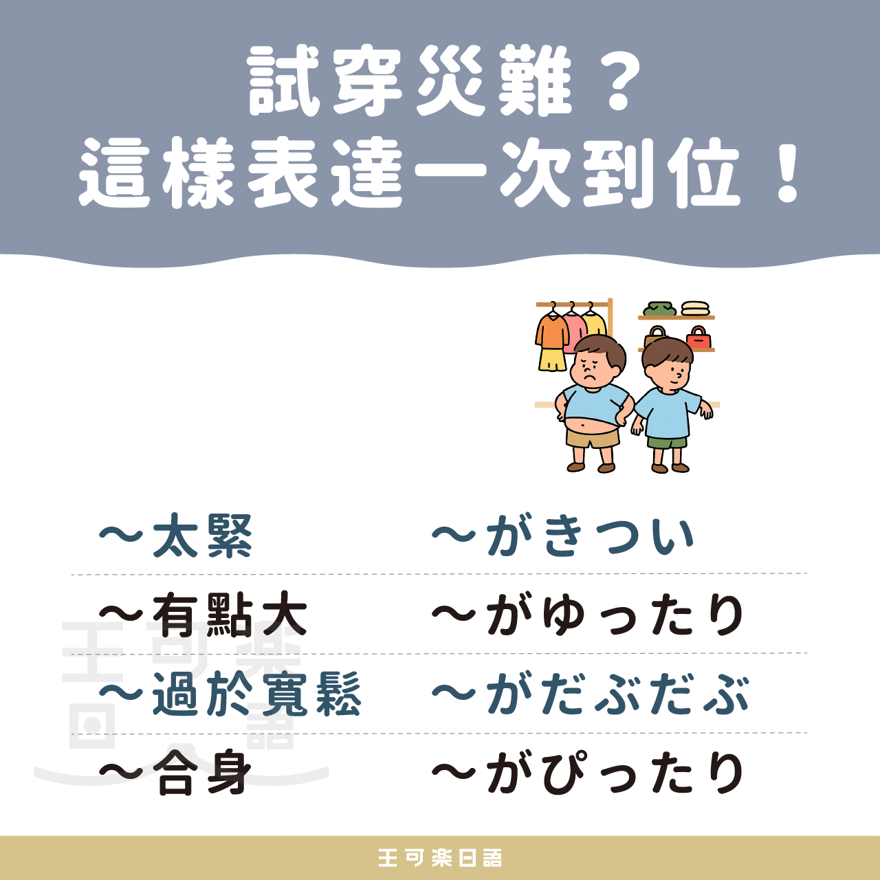 下次試穿時,記得把這幾句學起來,這樣就不怕錯過心儀的衣服囉。掌握這些簡單實用的形容詞,能讓你的日語更加自然也更生活化。〈延伸閱讀:衣服圖案的「模様」與「柄」〉