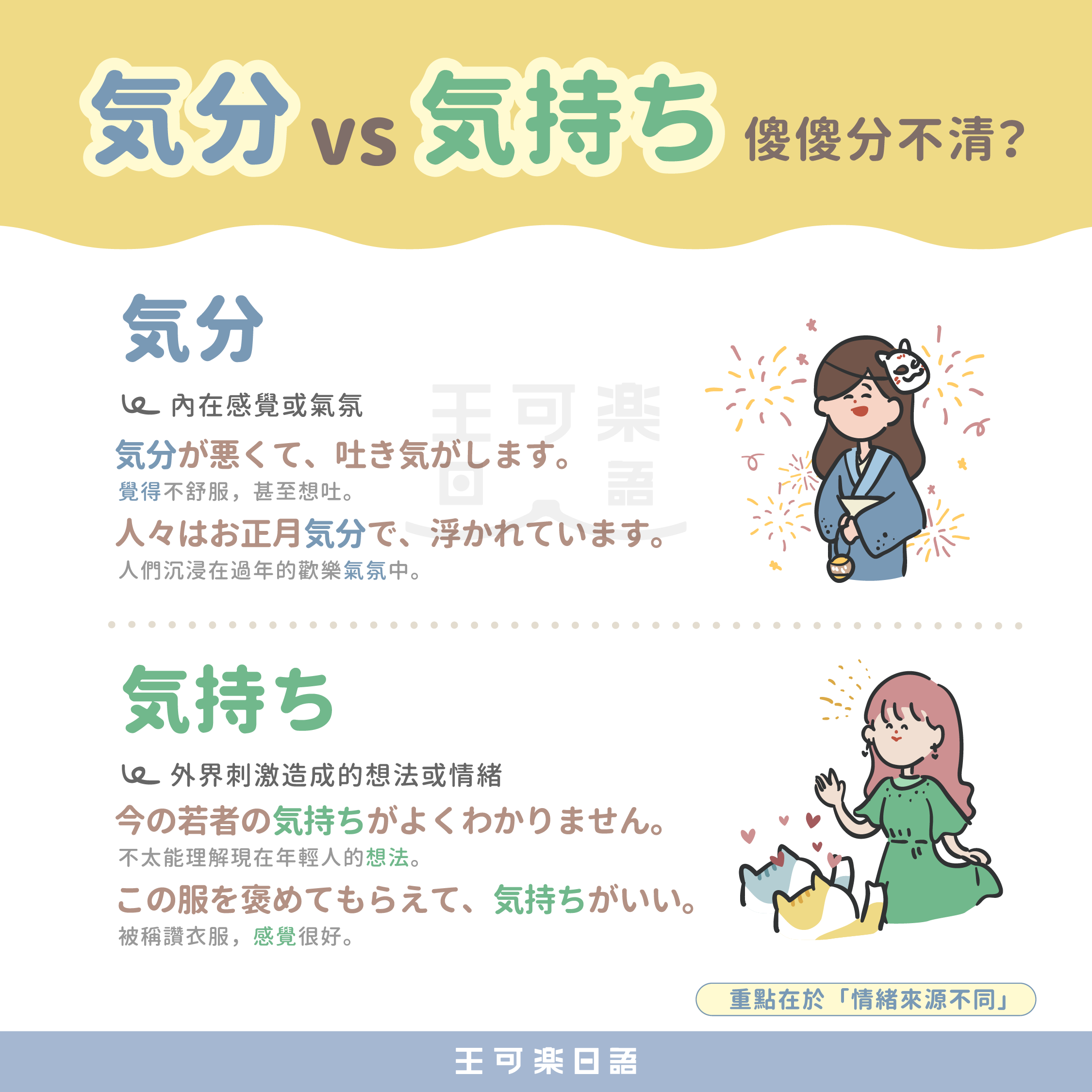 日文中「気分」與「気持ち」都與「情緒、感受」相關,卻不能混用。這兩個詞的差異,來自於情緒來源與語感範圍的不同。