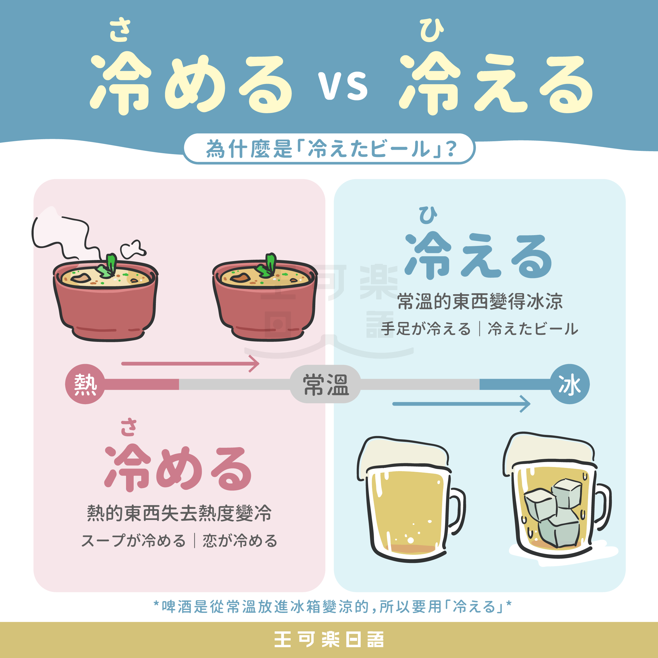 簡單記:冷める=熱變冷,冷える=常溫變冰。喝冰啤酒時,記得只能說「冷えたビール」喔!
