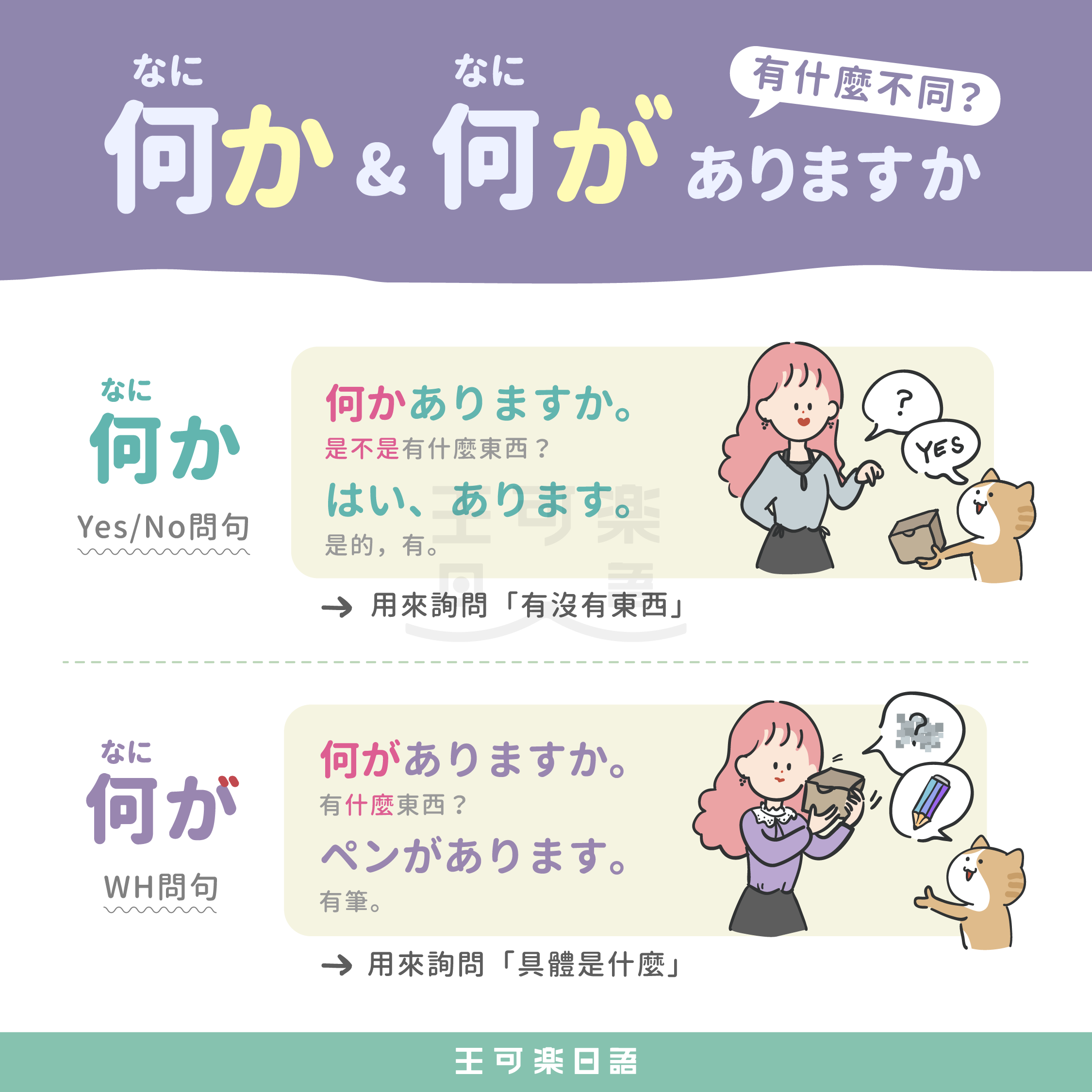 「何か」與「何が」都能翻成「什麼」,但實際用法完全不同。