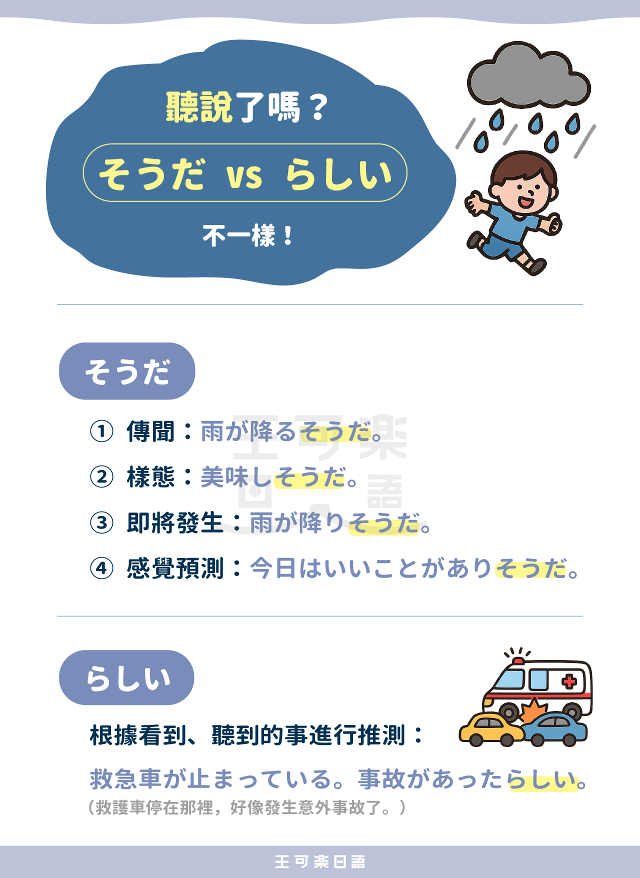 以下依照原文說明,整理「そうだ」的四種用法,並比較兩者的語感差異。