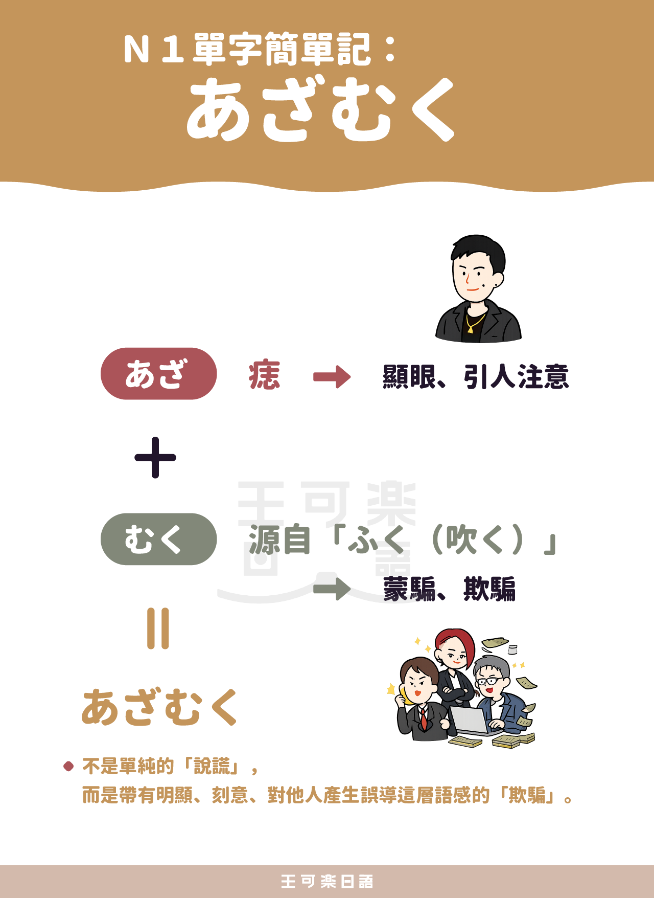 「あざむく」是 N1 日文檢定中常見的重要單字,意思是「偽裝」「欺騙」。