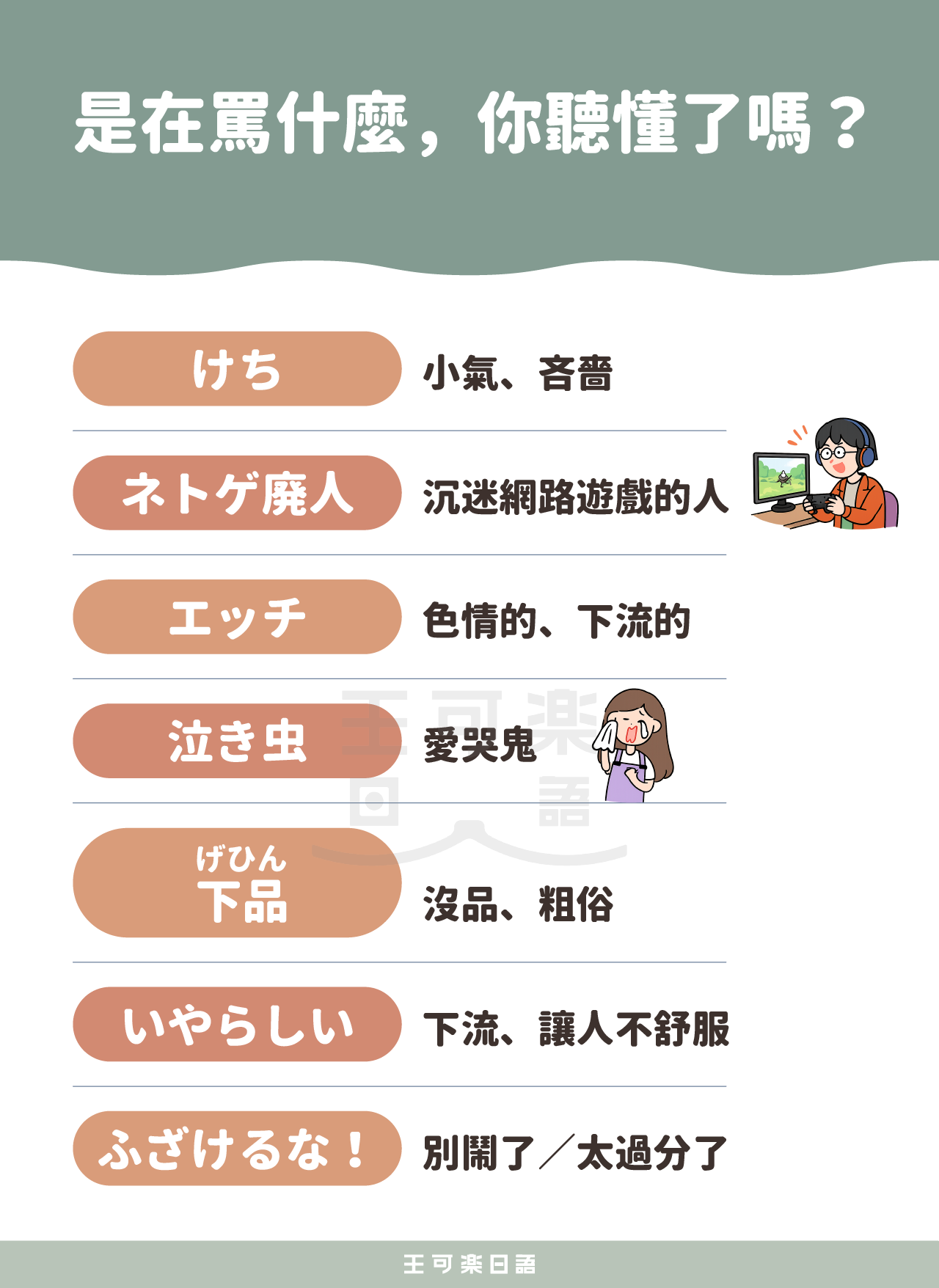 在日常會話、戲劇或網路上,有些日文詞一聽就覺得氣氛不太對,但又說不上來是在罵什麼。