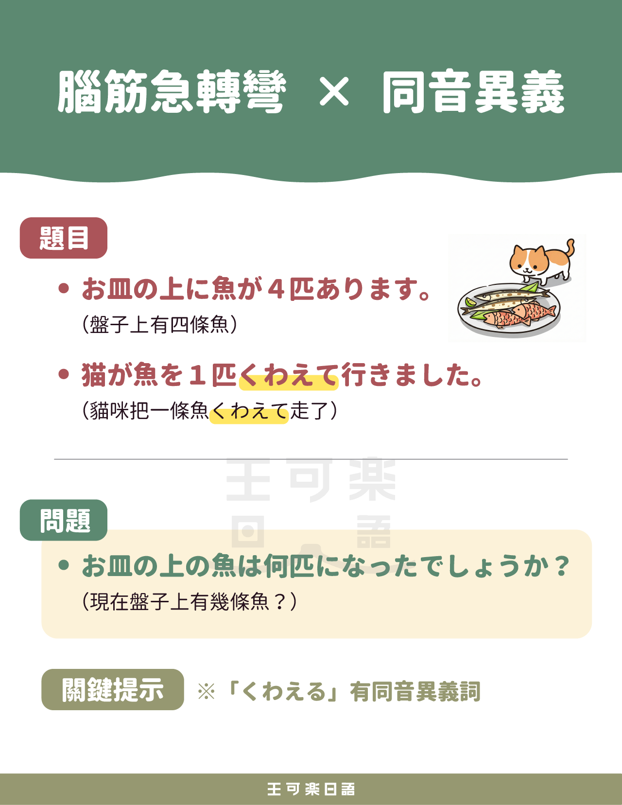 對方回答五條 → 「不對!因為貓咪把魚叼走了」