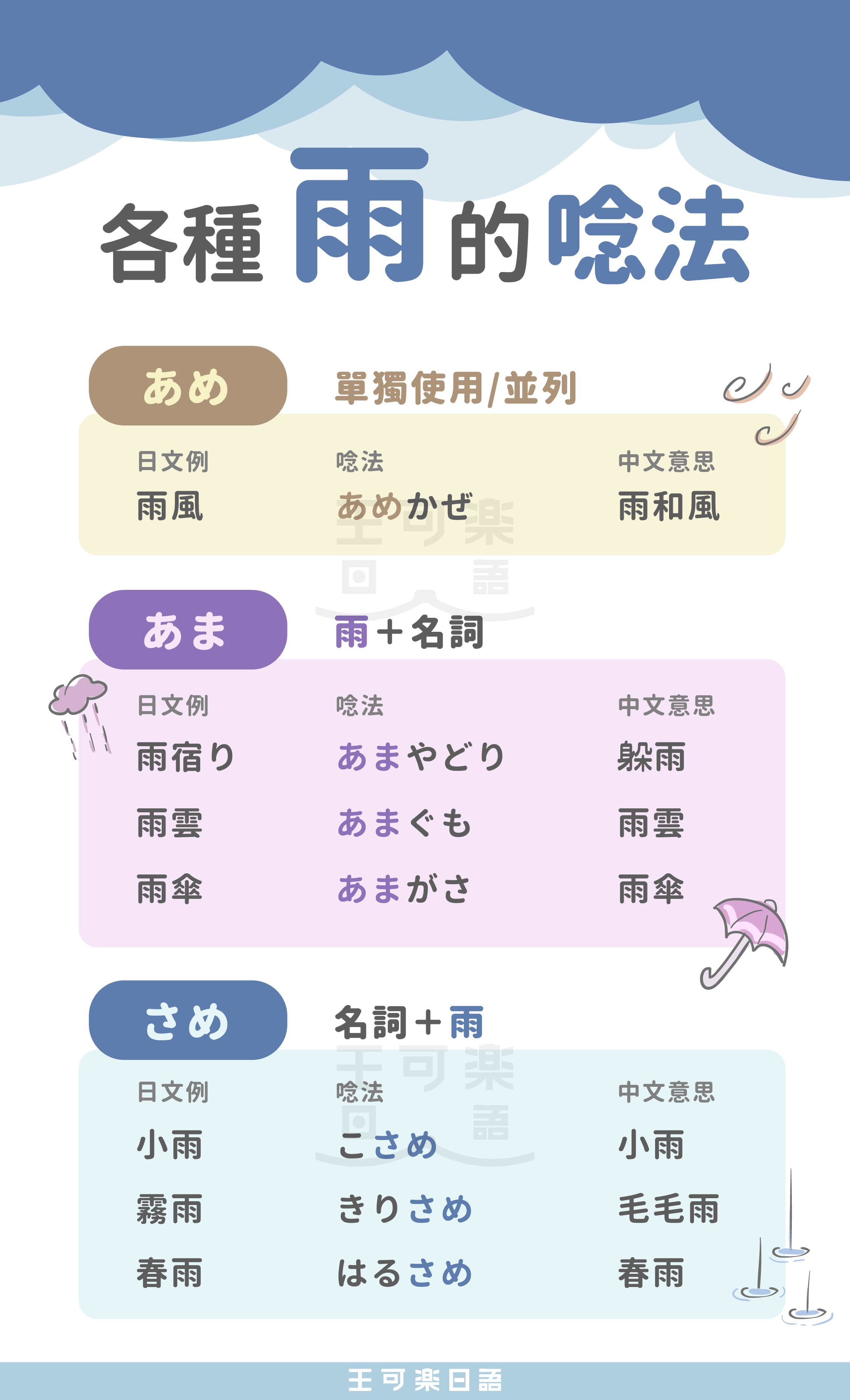在日文中,「雨」並不只有一種唸法,而是會依照詞彙的組合方式不同,出現不同的讀音。