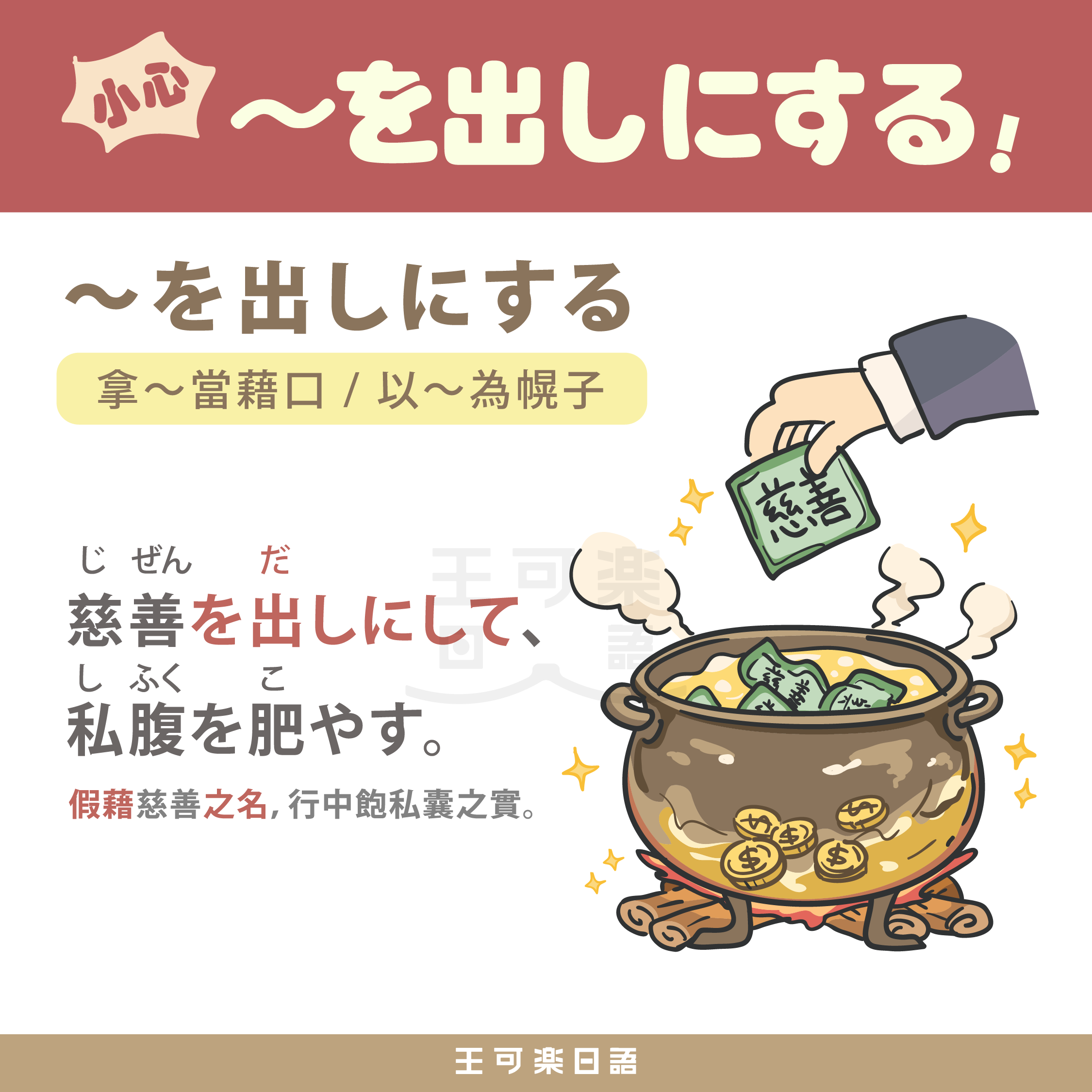 同理,「~を出しにする」就是把某個理由或名義當成「材料」,來達成自己真正的「利益」。