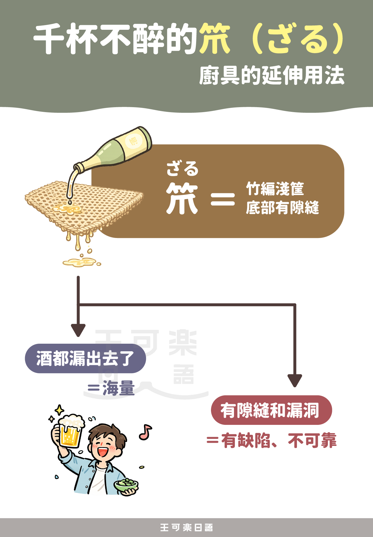 因為笊的底部有縫,倒進去的東西會全部漏掉,因此用來比喻「怎麼喝都不會醉的人」。