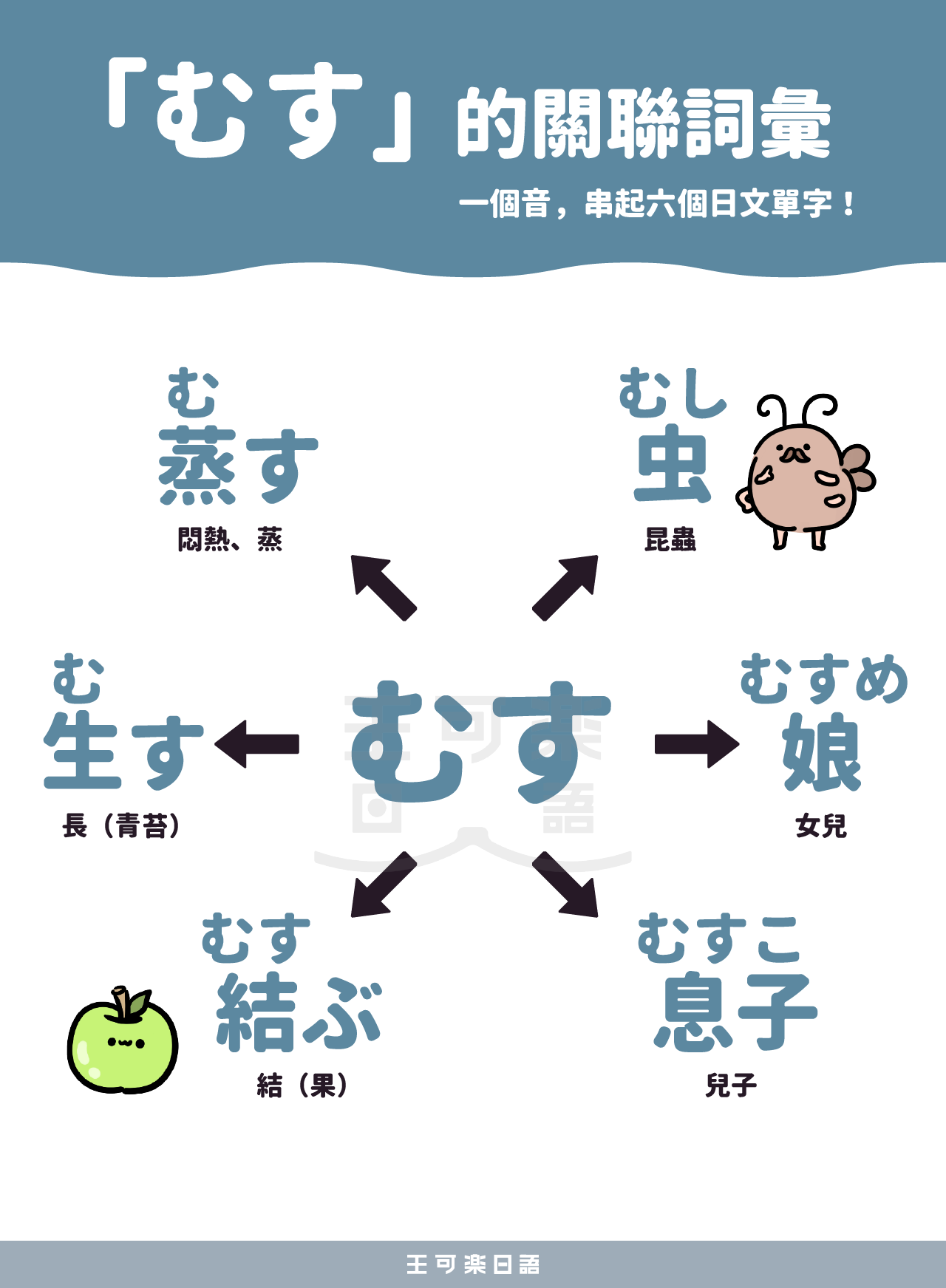 但你知道「蒸す」「蟲」「苔蘚」「果實」「兒子」「女兒」這些詞,其實全都從同一個音根 む 衍生出來嗎?