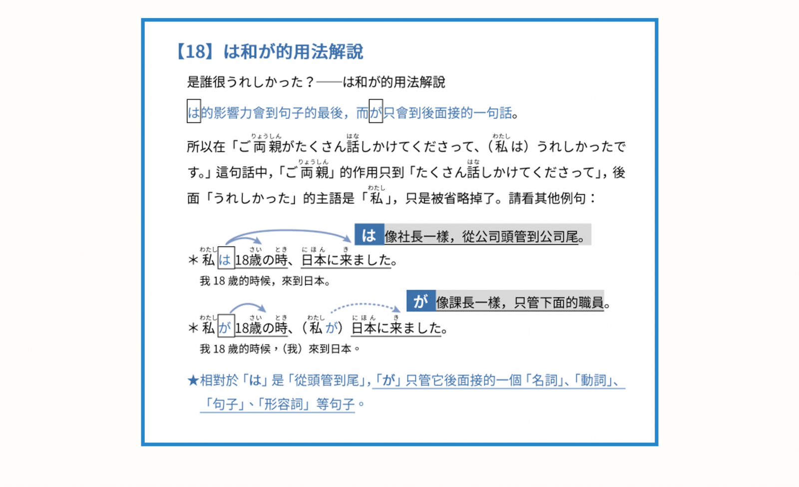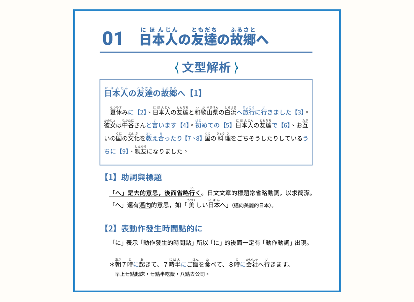 依照課文順序逐句拆解,搭配原句、功能說明、接續規則與例句,讓學習者能清楚看到每一個文法在句子中的作用。