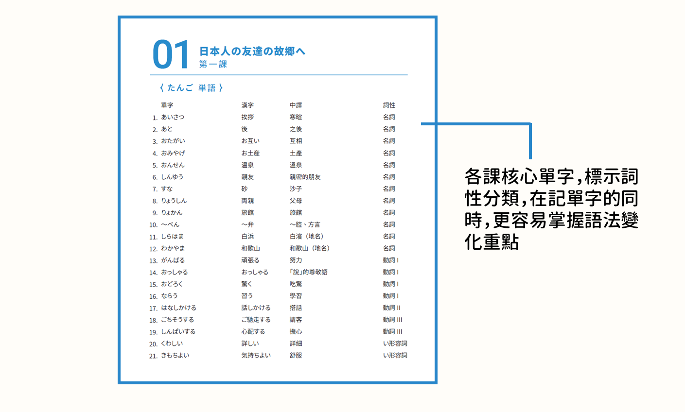每一課都有課文的核心單字整理,標示名詞、動詞等詞性分類,讓學習者在記單字的同時,更容易掌握語法變化重點,提升後續文章與文型練習的效率。
