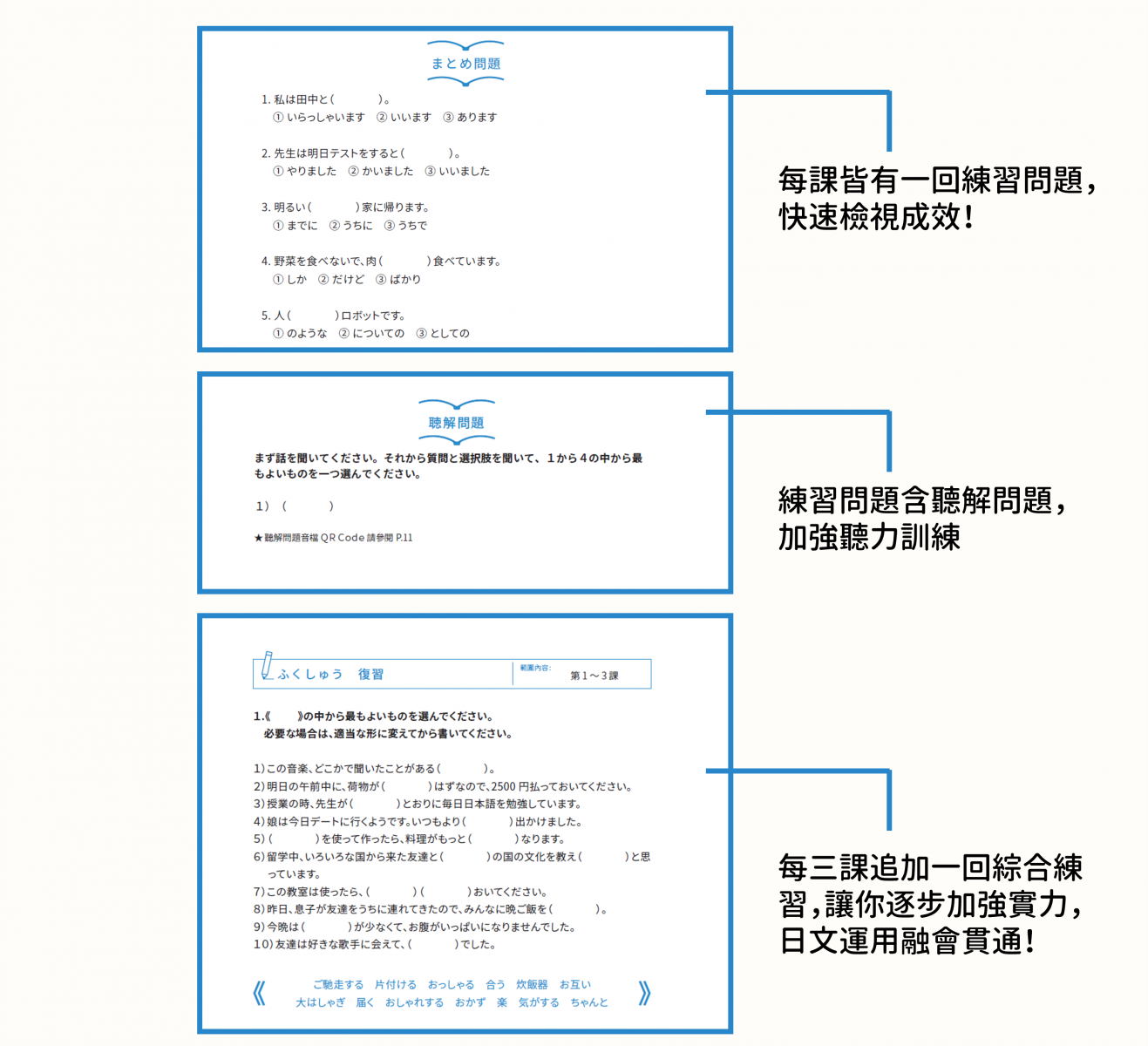 每課結尾皆附有「まとめ問題」與聽力練習題,供學生立即檢視學習成果。每3課再增加一回「總復習」,特別針對這幾課所收錄之精華文法,提供最完整的綜合練習。練習題數多、題型豐富、內容多元!