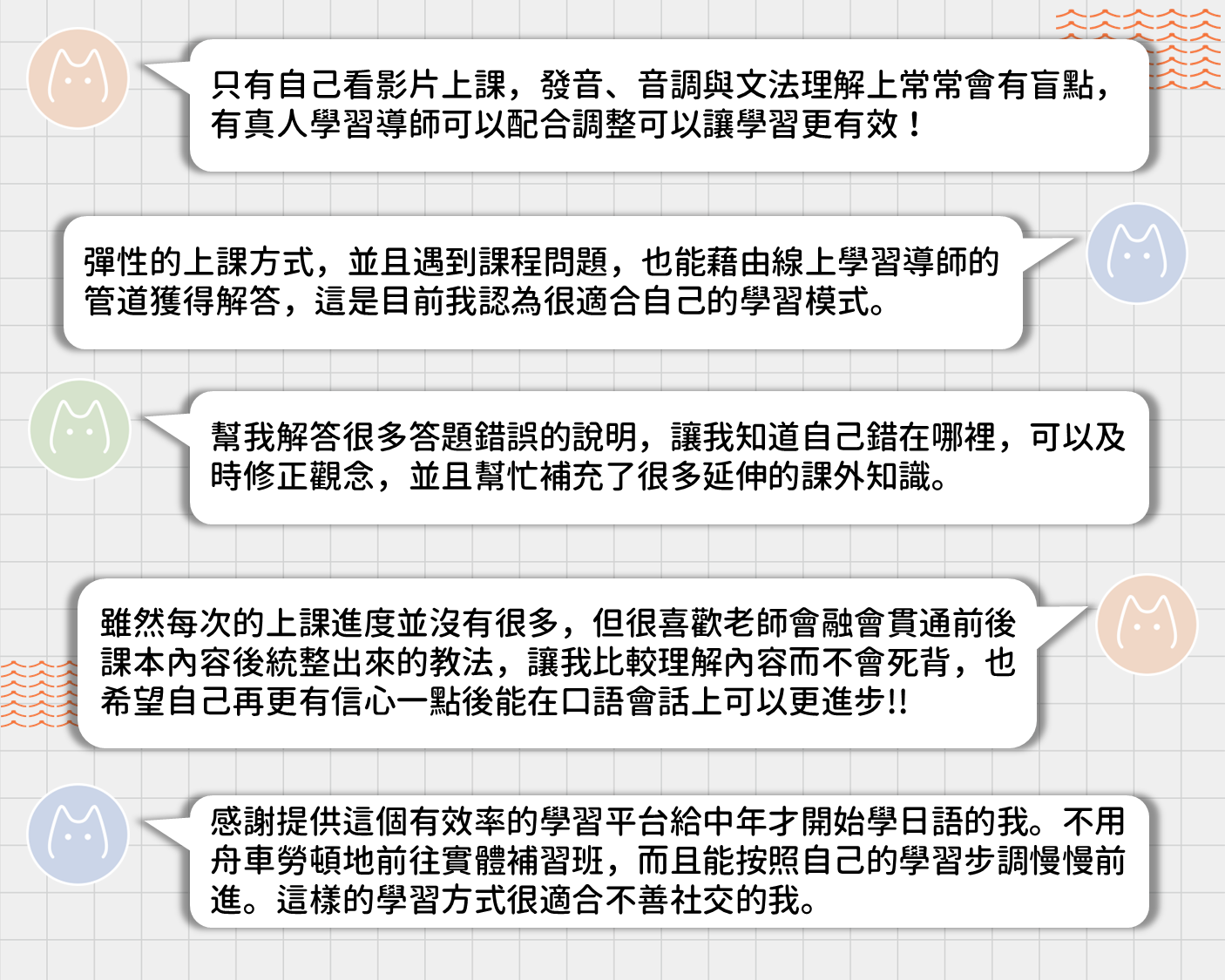 1.先免費體驗,了解課程內容與授課方式。2.透過日語能力測驗了解自己目前的學習程度,幫助找到最合適的課程。