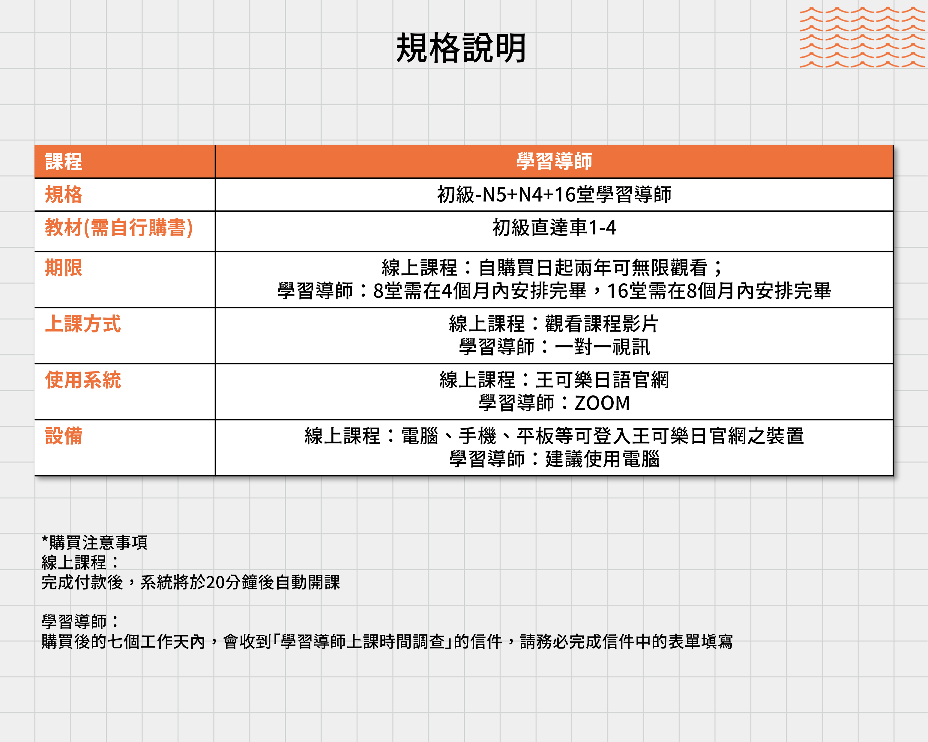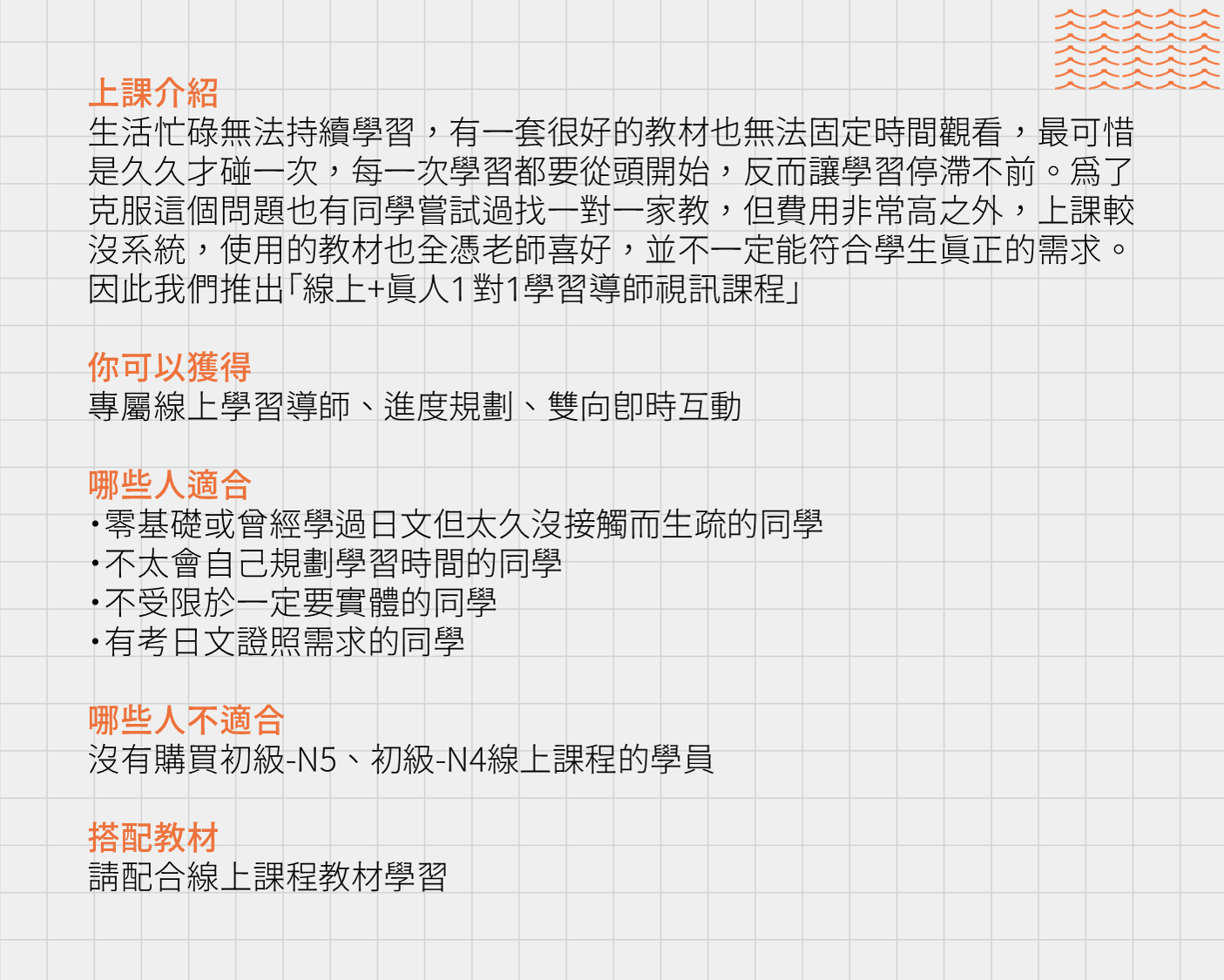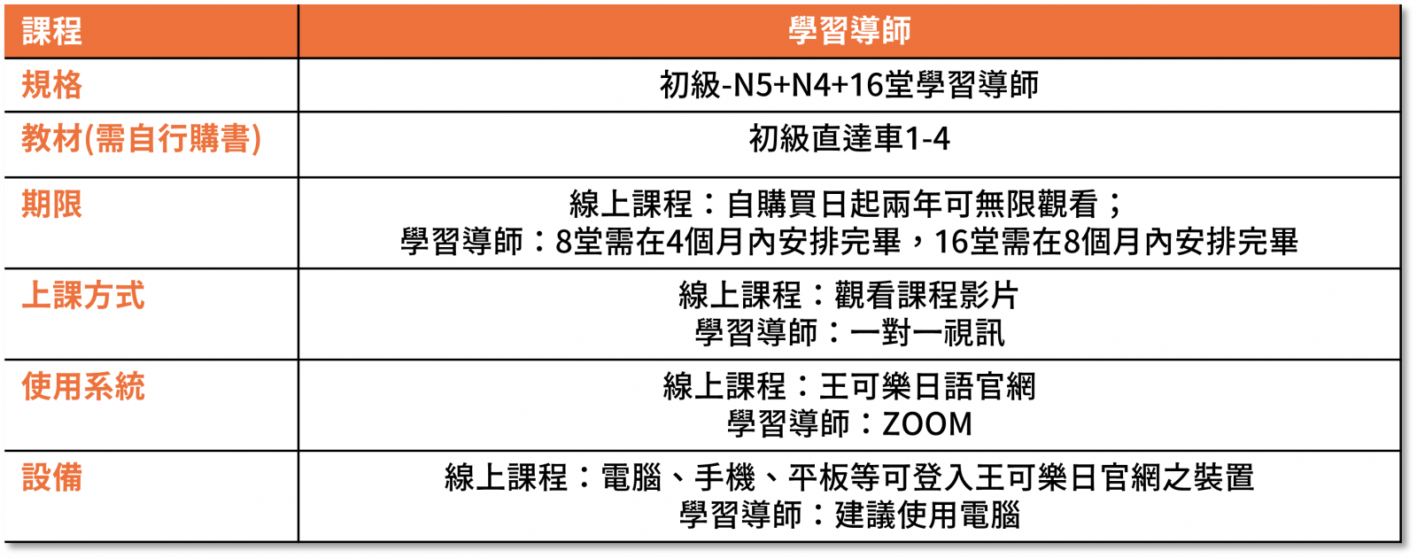 1.線上課程:登入官網直接觀看錄播課程,購買日起兩年內無限觀看,教材需自行至書店購買。2.學習導師課程:由專業日語老師一對一視訊個別指導,需搭配線上課程使用,依購買堂數需在指定期限內完成,課程結束後無法重看。8堂 → 4個月內上完;16堂 → 8個月內上完;24堂 → 12個月內上完;32堂 → 16個月內上完。
