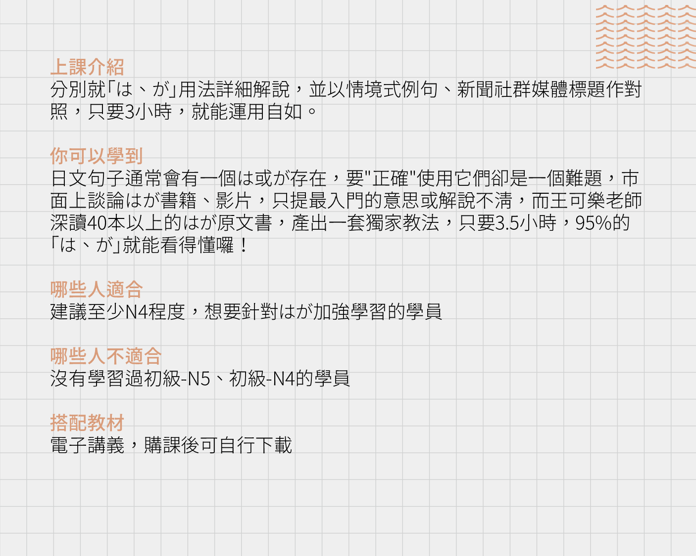 但在市面上,談論「は、が」的書籍、教學影片,都只提及「は、が」最入門的意思,或解說不清楚,讓很多學生除了在會話中會產生疑惑外,對於文章標題、內容的は、が用法,還是一知半解,常以猜測的心態去看待は、が。