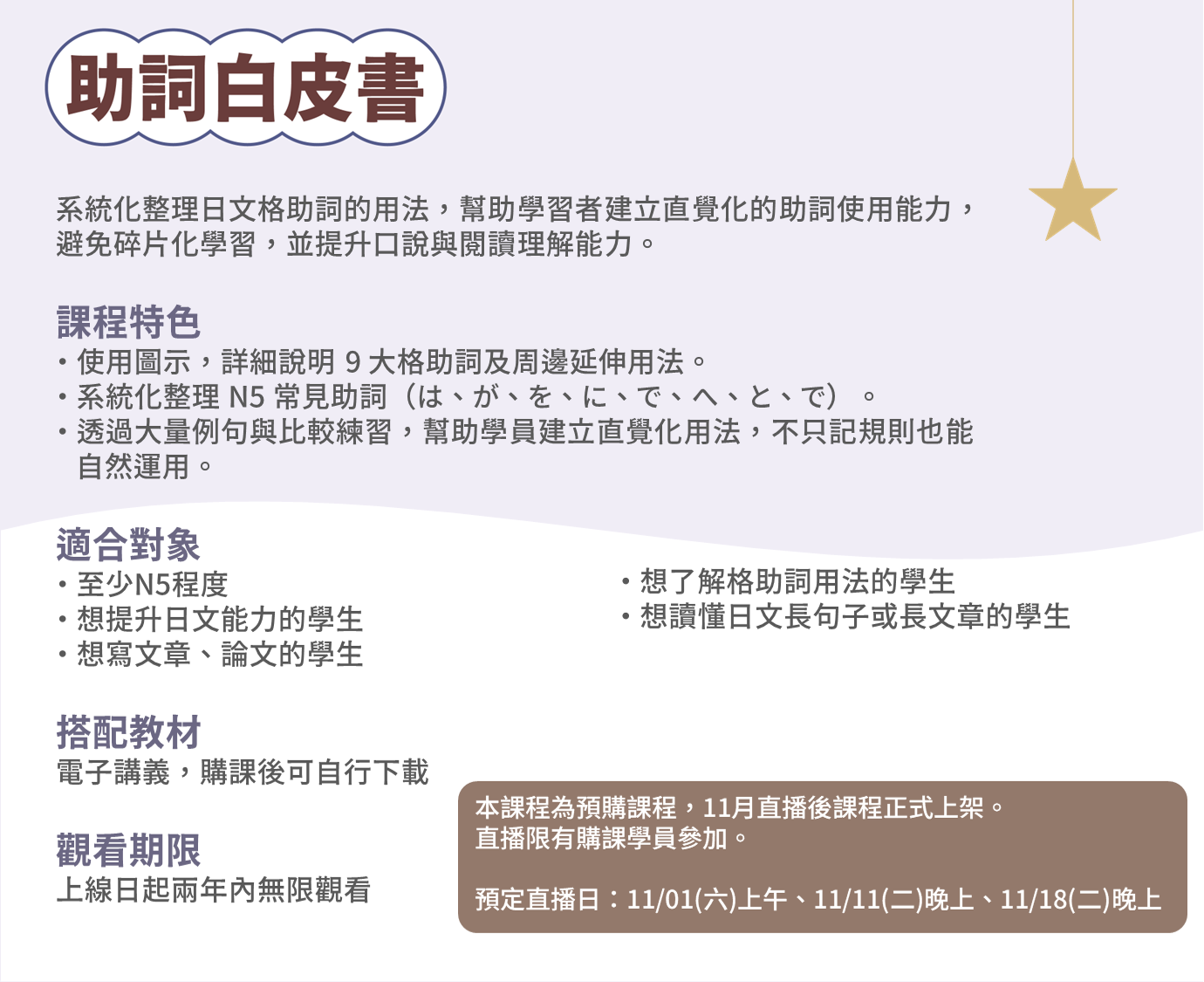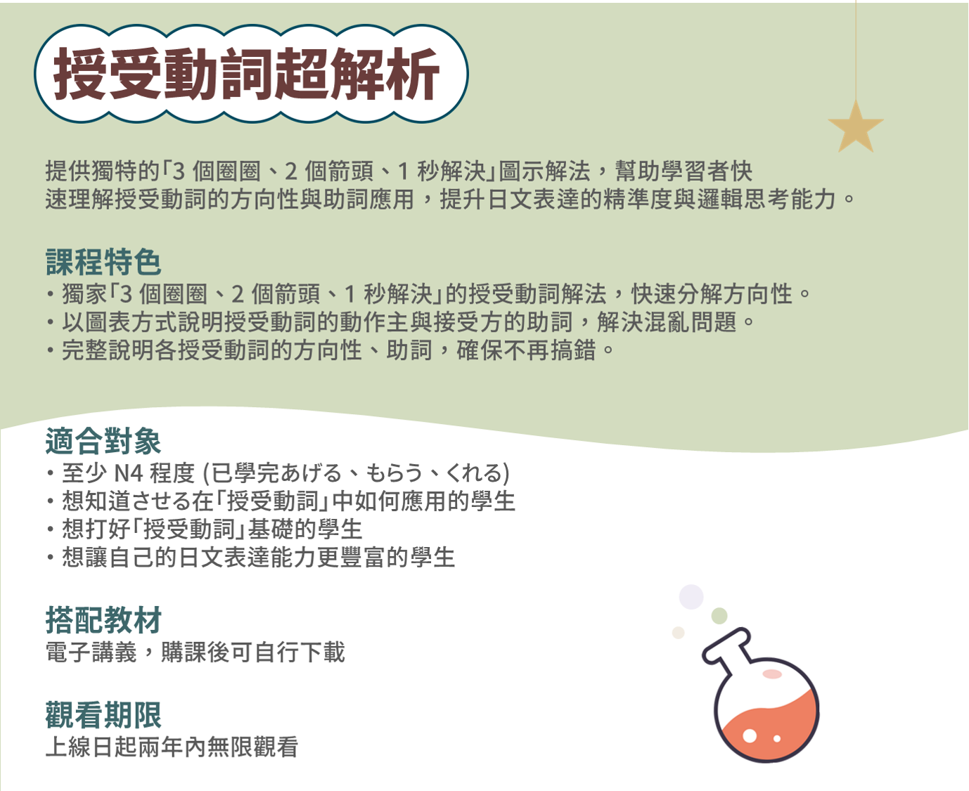 (一)線上課程:購買後系統自動開課,自開課之日起,兩年內可不限次數觀看。