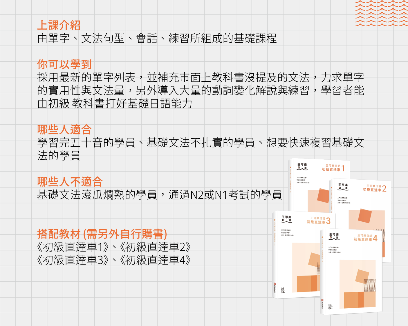 課程影片會有上課簡報畫面,建議另外搭配教材「初級直達車1、初級直達車2、初級直達車3、初級直達車4」學習,請至各大網路書店購書。