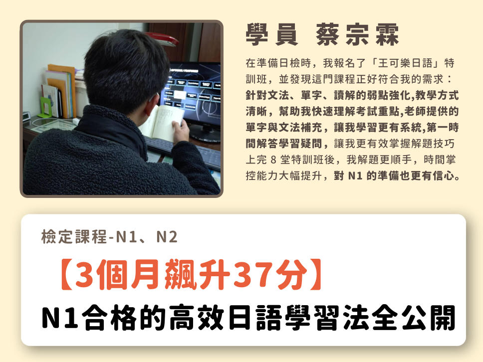 王可樂日語〈JLPT特訓班〉,由可樂老師親自授課,傳授包括文法、讀解考題的解題技巧,並且補充必考單字的延伸應用,讓你解題又快又正確!