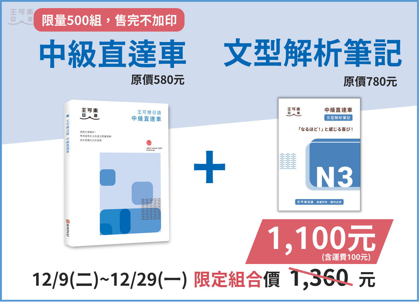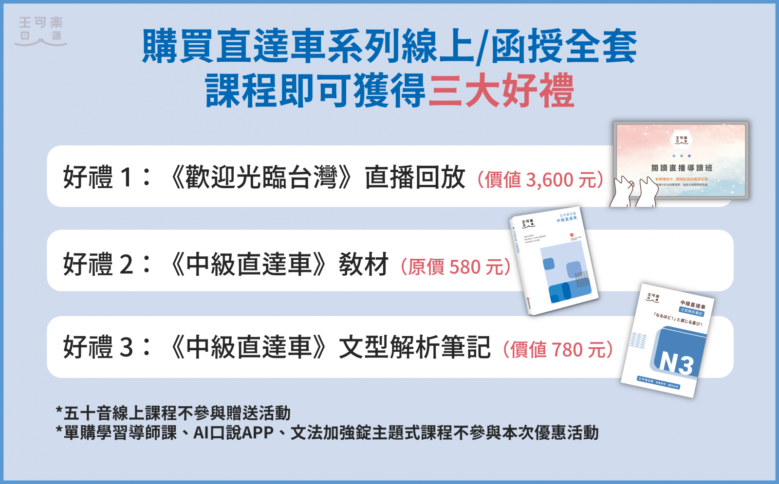2.購買直達車系列線上/函授課程之組合,所贈送之「直播回放影片、中級直達車教材、文型解析筆記」皆可累計獲得。(例:購買兩套課程,可獲得兩份對應贈品。)