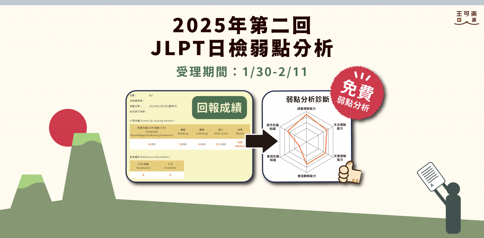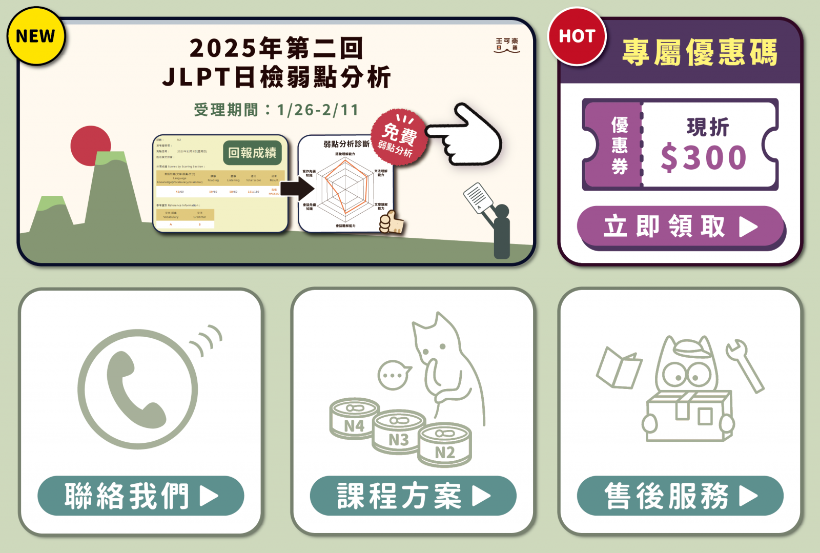 為了幫大家把分數「用對地方」,王可樂日語同步開放 「JLPT 日檢弱點分析」活動。只要到王可樂日語官方LINE,回答指定問題,填寫表單並上傳成績單,就能參加活動領取專屬的弱點分析書,2023年-2025年期間的成績單都可以參加。與其自己亂猜哪裡沒準備好,不如直接用成績,幫下一次考試先排好方向,了解哪些是失分關鍵、哪些已經具備實力,把這次的分數,轉換成下一步的準備策略吧!