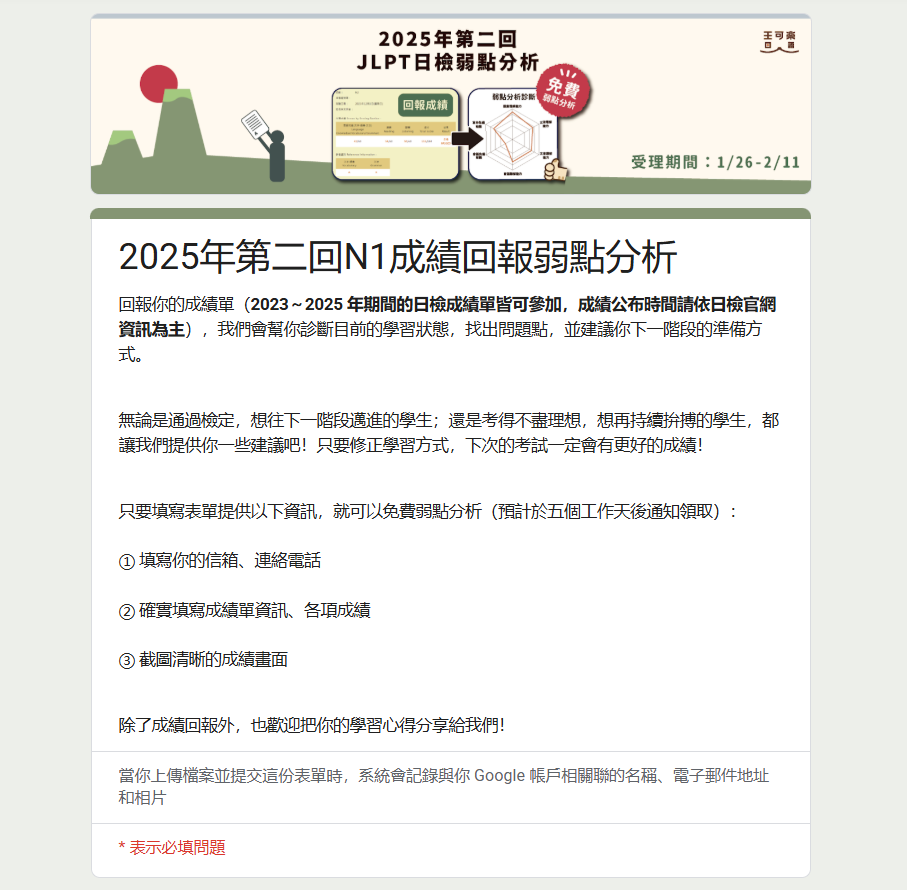 Step 4. 在表單中填寫您的信箱並上傳成績截圖。填寫完畢後,會於五個工作天後通知領取《JLPT日檢弱點分析》