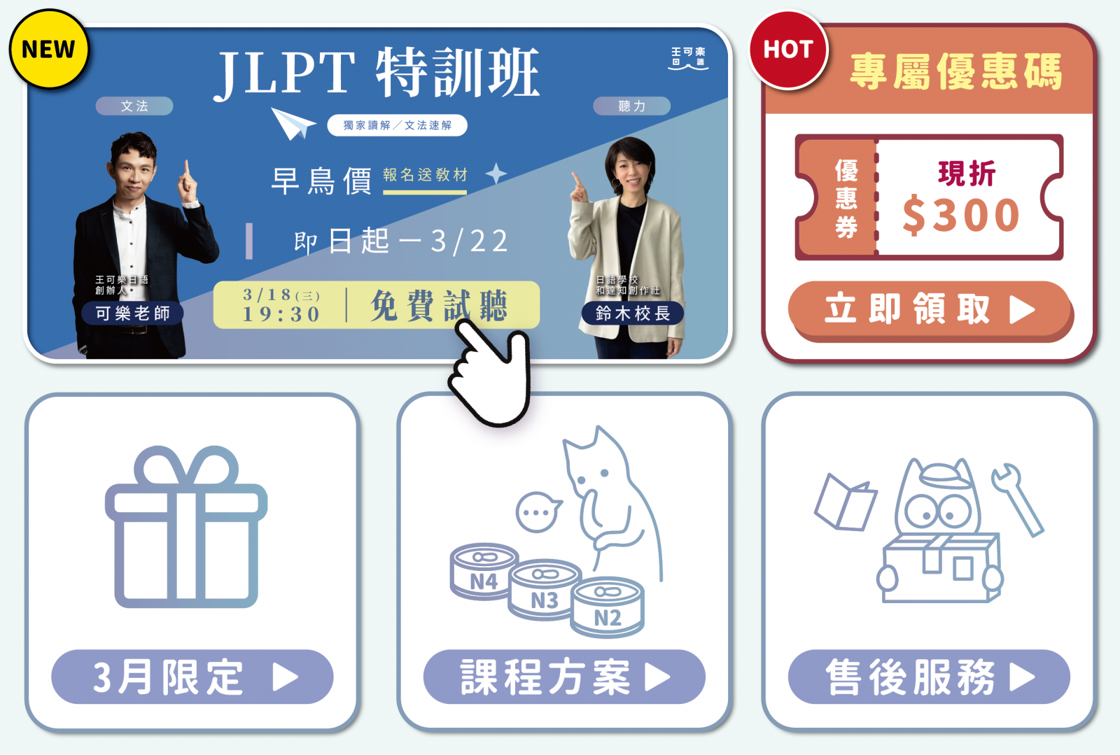 Step 2. 點選下方選單「JLPT特訓班免費試聽」