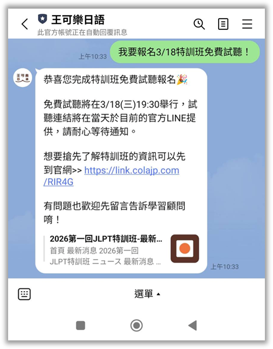Step 3. 收到回覆即表示報名成功,試聽連結將於當天在官方LINE提供